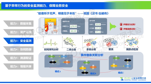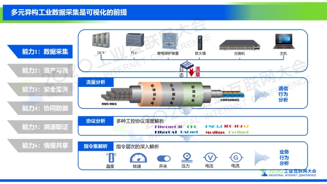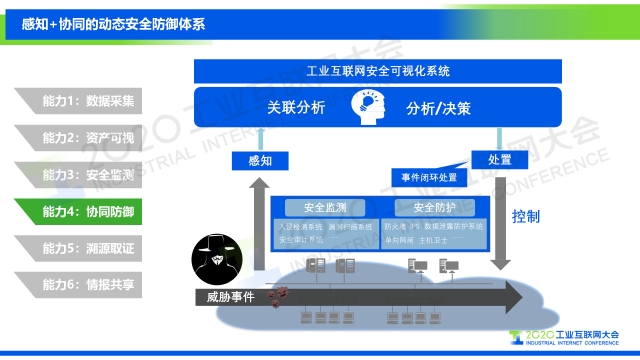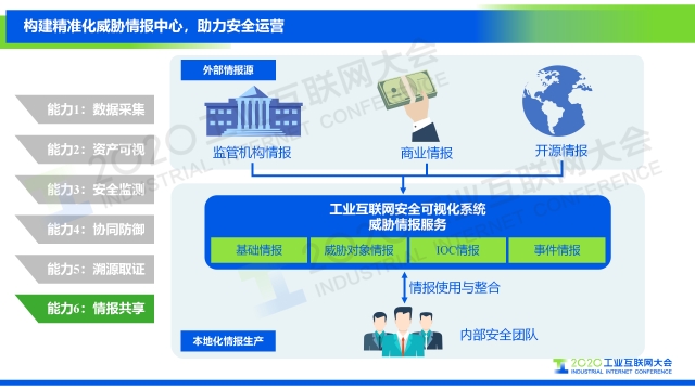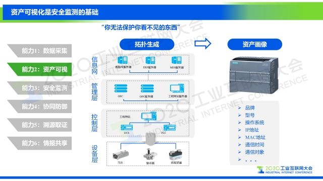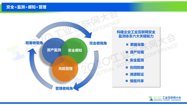 “基于我們對工業互聯網安全框架的解讀,從攻擊者視角、防御者視角和管理者視角三個維度出發,我們提出從資產監測、安全感知、風險管理三個方面實現工業互聯網安全的可視化,以及需要具備的六大關鍵能力,分別是數據采集、資產可視、安全監測、協同防御、溯源取證、情報共享。”