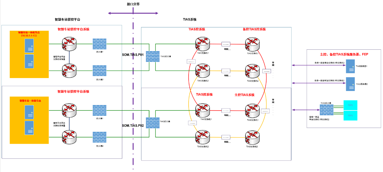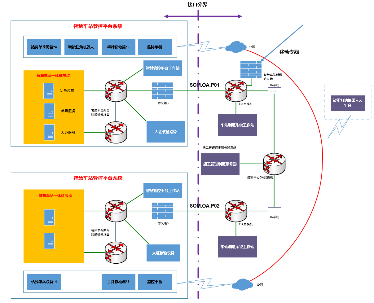 基于數(shù)據(jù)流進行梳理分析,智慧車站運營管控平臺需接入TIAS系統(tǒng),該平臺功能上設計為站級TIAS系統(tǒng)的上位系統(tǒng),即通過該平臺實現(xiàn)對TIAS中綜合監(jiān)控部分的設備監(jiān)控;網(wǎng)絡上,該系統(tǒng)需要在本站訪問TIAS服務器、FEP,并通過TIAS環(huán)網(wǎng)分別訪問主控、備控的TIAS實時服務器(機電)、FEP,以及實現(xiàn)兩個及以上車站的運營管控平臺網(wǎng)絡互通(僅限于一體機的部分業(yè)務虛擬節(jié)點),傳輸內(nèi)容為常規(guī)綜合監(jiān)控監(jiān)控數(shù)據(jù),不含視頻流。智能掃地機器人、站務單兵設備、手持移動終端、監(jiān)控平板(均設置靜態(tài)IP)通過無線與車站公網(wǎng)連接,車站公網(wǎng)通過控制中心公網(wǎng)與控制中心OA系統(tǒng)的接口實現(xiàn)上述設備與車站OA系統(tǒng)的通信。