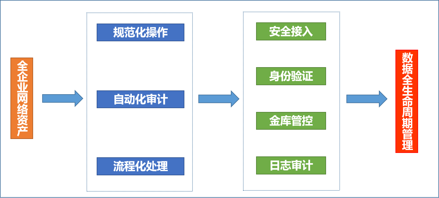 面向全企業(yè)網(wǎng)絡(luò)資產(chǎn),圍繞“規(guī)范化操作、自動化審計、流程化處理”目標,開展精細化安全管理。以網(wǎng)絡(luò)安全管控平臺為抓手,實現(xiàn)安全接入、身份驗證、金庫管控、日志審計等管控能力,落實數(shù)據(jù)全生命周期管理。