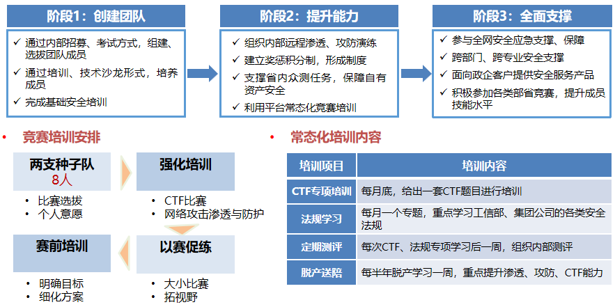 集約化安全運營中心需要一支知守善攻的安全保障團隊。中國移動通信集團安徽有限公司認真規(guī)劃安全保障團隊的建設(shè)計劃,通過創(chuàng)建團隊、提升能力、全面支撐三個階段,穩(wěn)步提升人員的綜合實力,并成立專門面向競賽的種子隊,針對性的培養(yǎng)行業(yè)頂尖的網(wǎng)絡(luò)安全人才,打造一支高水平安全攻防技術(shù)隊伍,積極參加企業(yè)內(nèi)外專項行動及重大活動的網(wǎng)絡(luò)安全保障工作,覆蓋全公司的網(wǎng)絡(luò)安全各領(lǐng)域。