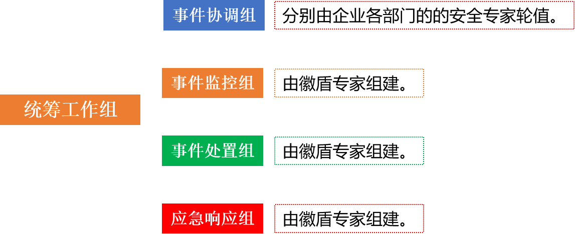 為保證重保行動順利開展,統(tǒng)籌工作組下設(shè)事件協(xié)調(diào)組、事件監(jiān)控組、事件處置組和應(yīng)急響應(yīng)組分別開展工作。