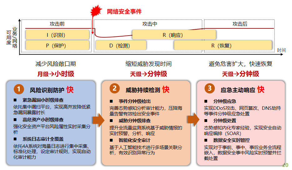 在面對網(wǎng)絡(luò)攻擊時,積極應(yīng)對“侵”、“擾”、“竊”,深化IPDRR動態(tài)防護理念在現(xiàn)網(wǎng)攻防實戰(zhàn)中落地,突出強化保障中響應(yīng)速度快的能力,提升網(wǎng)絡(luò)和數(shù)據(jù)安全端到端安全防護水平。