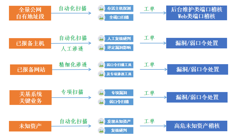采用自動化掃描、人工滲透相結(jié)合方式,開展暴露面資產(chǎn)的發(fā)現(xiàn)、風(fēng)險的檢測,實現(xiàn)多種掃描器交叉掃描、不同人員交叉滲透,依托網(wǎng)絡(luò)安全運維平臺,派發(fā)預(yù)警工單、跟蹤閉環(huán)。