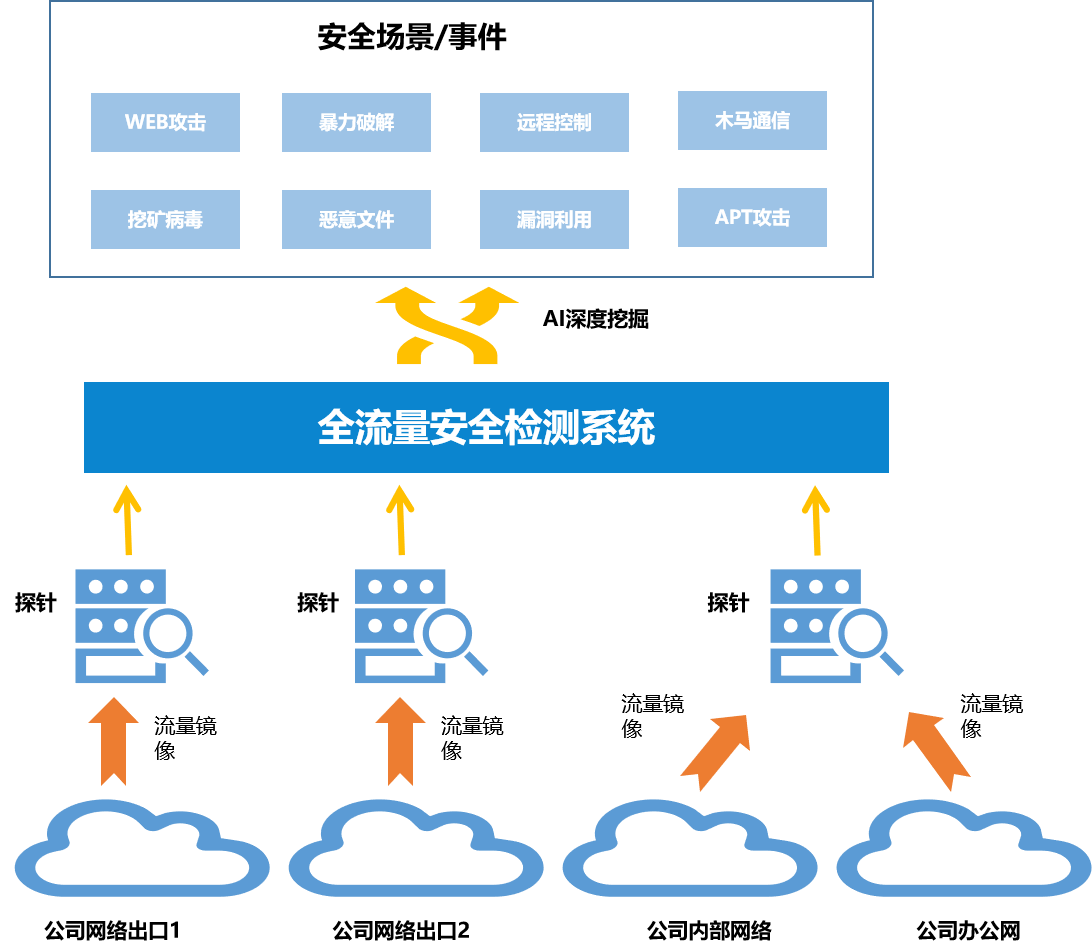 提升集約化安全運營中心對新業(yè)務(wù)的保障能力,在企業(yè)重要數(shù)據(jù)出口處部署全流量安全檢測系統(tǒng),開展安全風(fēng)險深度挖掘。對網(wǎng)絡(luò)鏈路全流量采集存儲、全數(shù)據(jù)分析,引入AI檢測引擎,基于規(guī)則+行為分析,為識別發(fā)現(xiàn)漏洞利用、高級木馬通訊、APT攻擊、數(shù)據(jù)竊密等提供更有效的監(jiān)測手段。