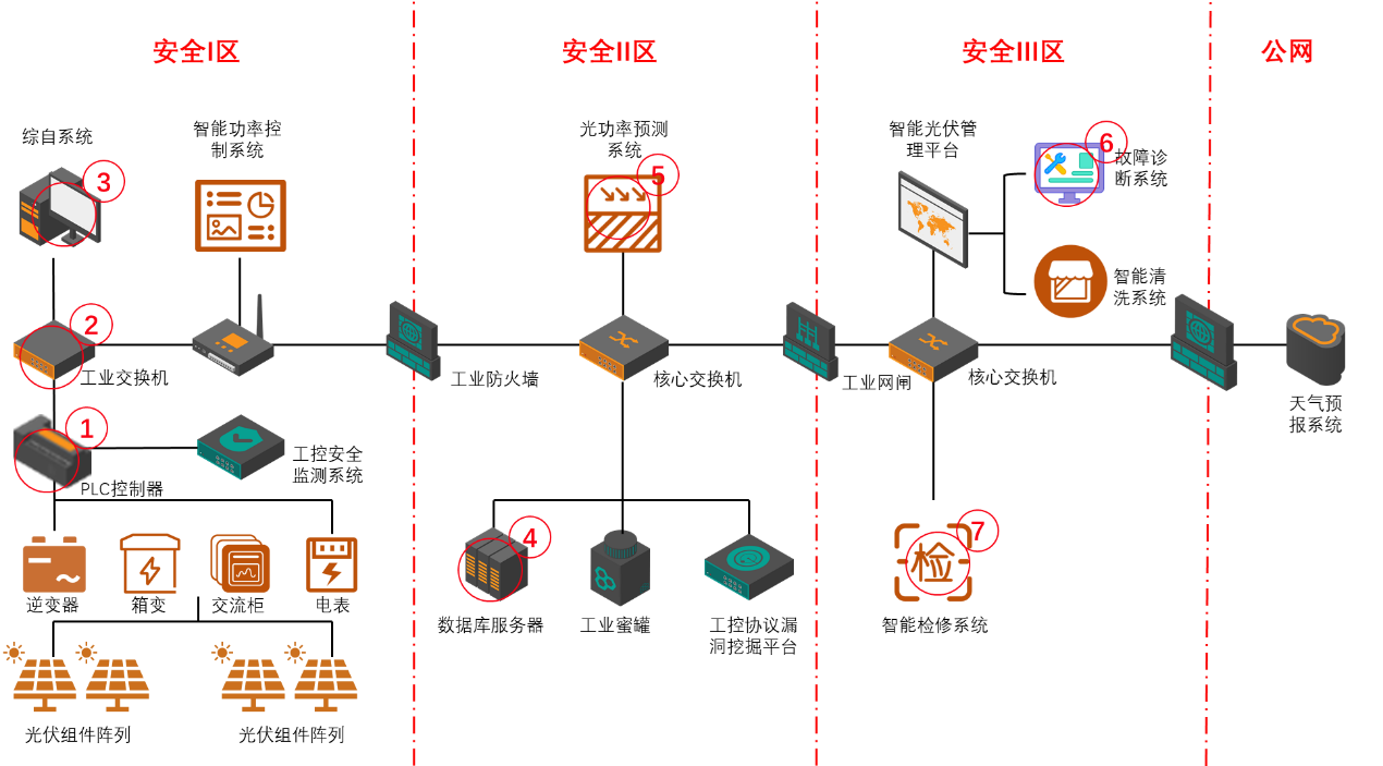 攻防演練系統:是整個平臺的基座,通過工控仿真平臺100%還原新能源場站生產場景,并部署攻擊系統、安全設備系統、工業現場沙盤和效果展示系統,為安全應用系統和技術研究系統提供基礎支撐。