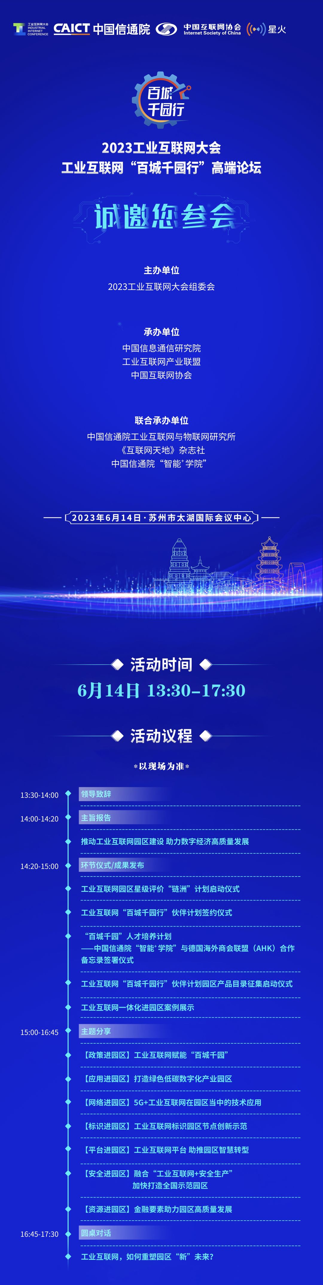 工業(yè)互聯(lián)網(wǎng)“百城千園行”高端論壇將于6月14日下午13:30在蘇州市太湖國(guó)際會(huì)議中心舉辦。論壇以“工賦園區(qū)·數(shù)智未來”,為主題通過主旨報(bào)告、環(huán)節(jié)儀式、成果發(fā)布、主題分享、圓桌對(duì)話等形式,賦能企業(yè)數(shù)字化轉(zhuǎn)型升級(jí),推動(dòng)工業(yè)互聯(lián)網(wǎng)高質(zhì)量發(fā)展。會(huì)上,將舉行多項(xiàng)重磅儀式活動(dòng)。