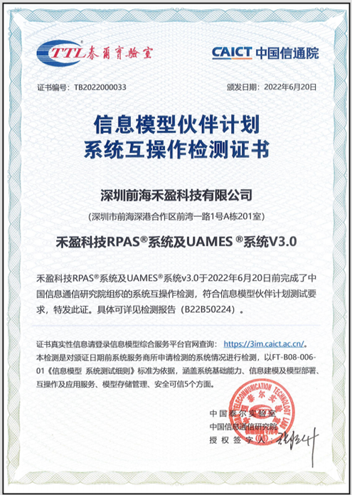 深圳前海禾盈科技有限公司(以下簡稱“前海禾盈”)自主研發的RPAS?智能自動化企業管理系統與UAMES?柔性化智能生產調度系統,分別于2020年和2022年順利通過信通院組織的信息模型伙伴計劃互操作產品評測,其166個測試項目全部合格,并在本次論壇上獲頒證書。