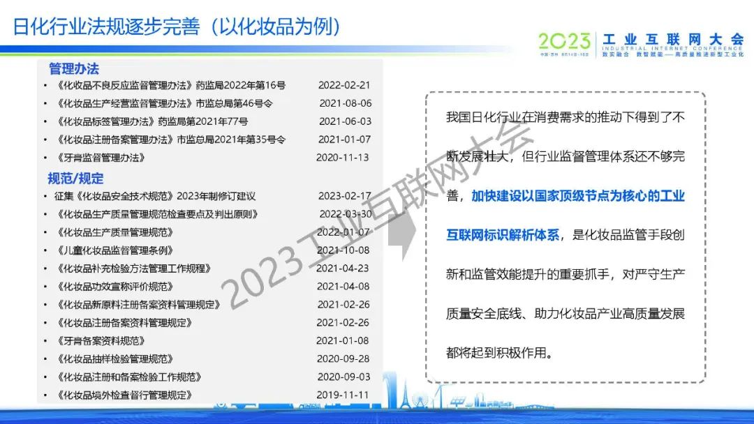 趙鵬飛表示,我國日化行業在消費需求的推動下得到了不斷發展壯大,但行業監督管理體系還不夠完善,加快建設以國家頂級節點為核心的工業互聯網標識解析體系,是日化產品監管手段創新和監管效能提升的重要抓手,對嚴守生產質量安全底線、助力化妝品產業高質量發展都將起到積極作用。