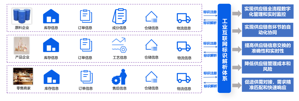 通過工業互聯網標識解析體系,全面管理整個行業供應鏈需要的共享信息,高效管理上下游產業鏈的庫存信息、訂單信息、物流信息等內容,實現行業統籌安排,提高產品質量的同時降低產品成本。實現行業上下游企業關聯:借助行業二級節點,將行業上下游企業之間的庫存、訂單、物流、營銷等信息串聯起來;實現供應鏈間數據自動處理:通過統一的標識處理,行業內各企業間的數據,跨地域、跨平臺、跨系統的在異構環境下實現自動交互,降低人工參與可能帶來的錯誤,實現數據共識;實現供應鏈數據應用:基于上下游各個企業數據,應用到整個行業指導行業生產經營。