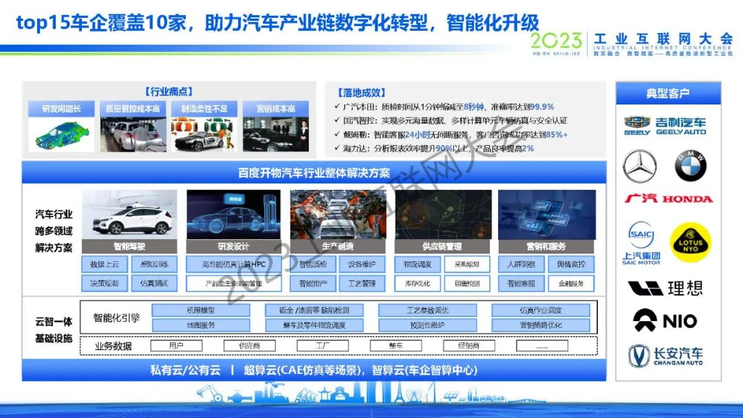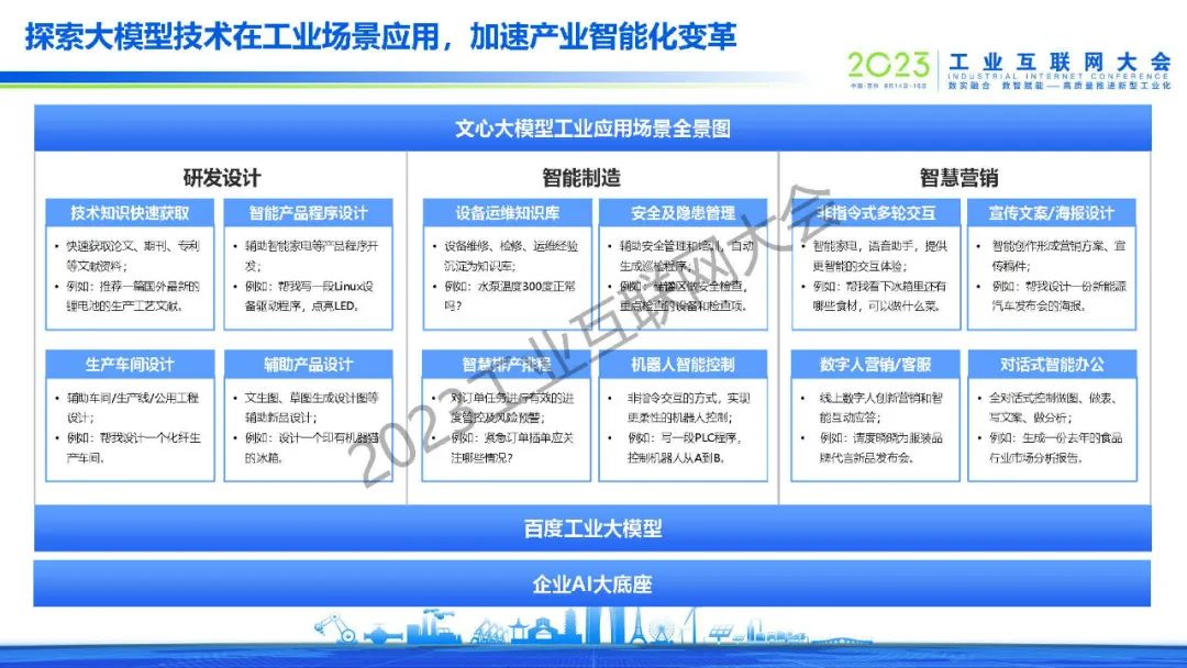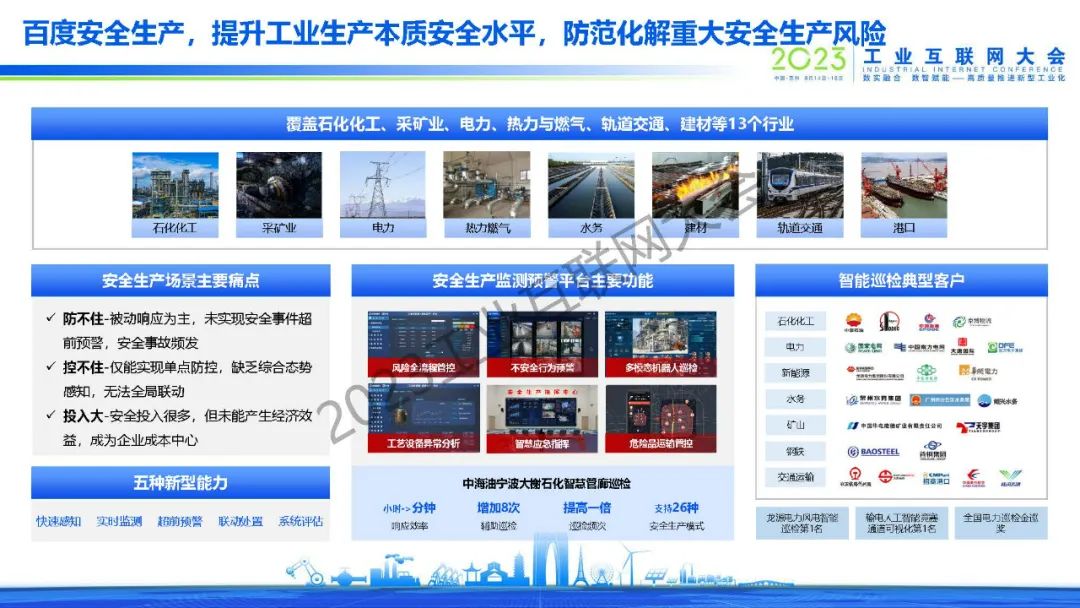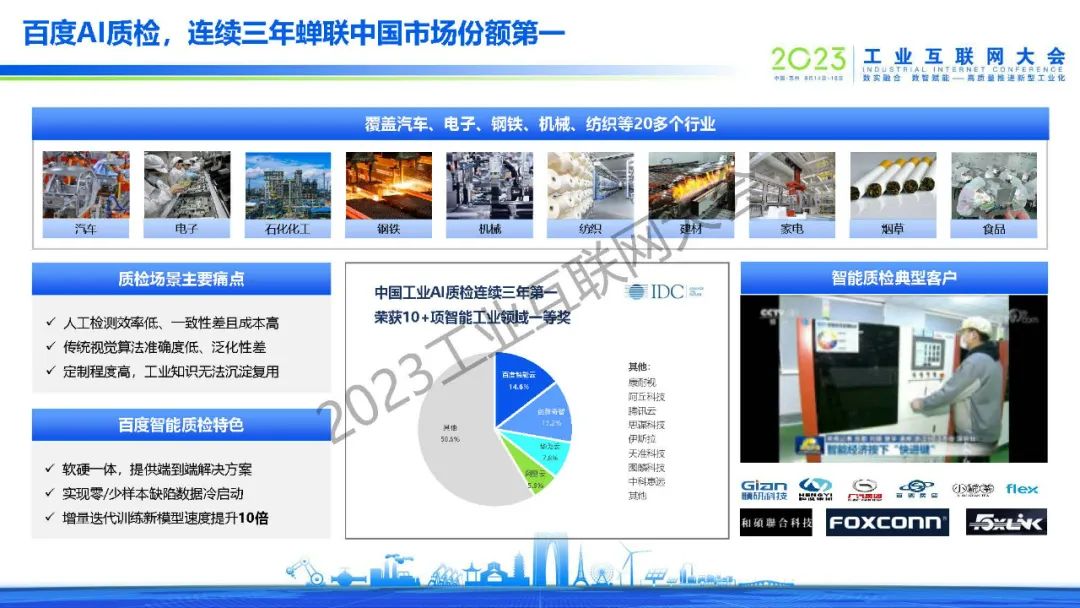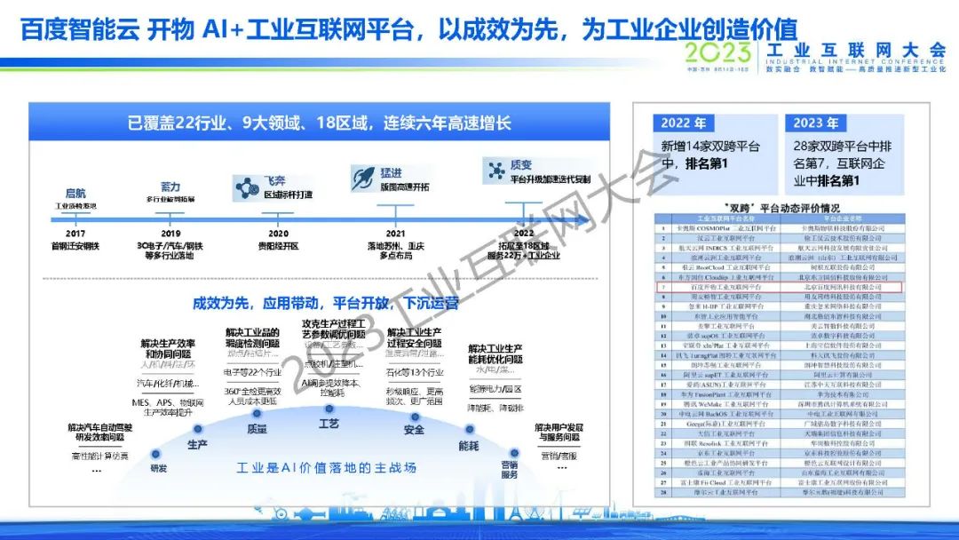 黃鋒表示,百度從2017年單一的AI質(zhì)檢場景開始,逐漸拓展到安全生產(chǎn)、能耗優(yōu)化、智能調(diào)度等場景,在生產(chǎn)、銷售、客戶服務(wù)、供應(yīng)鏈等環(huán)節(jié)都做了大量成功案例,同時從行業(yè)拓展到區(qū)域,和地方政府共建了多個工業(yè)互聯(lián)網(wǎng)產(chǎn)業(yè)基地,批量賦能當(dāng)?shù)禺a(chǎn)業(yè)和客戶企業(yè)。2017年到今天,百度開物工業(yè)互聯(lián)網(wǎng)實現(xiàn)了規(guī)模化增長,同時也得到了工信部的認(rèn)可,在2022年評為新增14家雙跨平臺第一名,2023年在所有互聯(lián)網(wǎng)企業(yè)中排名第一。未來也將繼續(xù)探索大模型技術(shù)在工業(yè)場景應(yīng)用,將自身沉淀出的工業(yè)AI技術(shù)沉淀為平臺,和行業(yè)合作伙伴一同賦能客戶、產(chǎn)生價值,為工業(yè)互聯(lián)網(wǎng)的發(fā)展盡自己的一份力量。