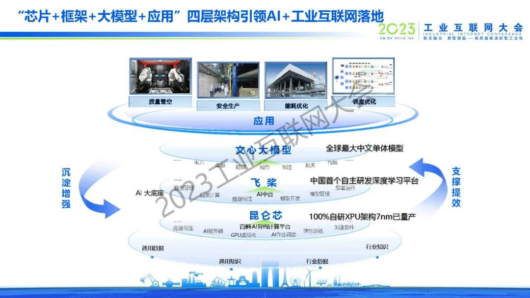 “從數(shù)據(jù)中挖掘出工業(yè)知識,并在應(yīng)用中真正產(chǎn)生降本增效的價值,才是工業(yè)互聯(lián)網(wǎng)未來發(fā)展的趨勢,從數(shù)據(jù)中挖掘知識就是AI擅長的事。百度從2017年開始探索AI與工業(yè)互聯(lián)網(wǎng)的融合,秉承著“成效為先,應(yīng)用帶動,平臺開放,下沉運營”的發(fā)展理念,通過自主研發(fā)的“芯片+框架+大模型+應(yīng)用”四層架構(gòu),引領(lǐng)AI+工業(yè)互聯(lián)網(wǎng)在各個場景的落地。“
