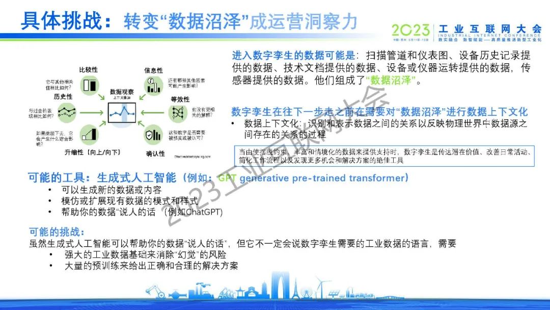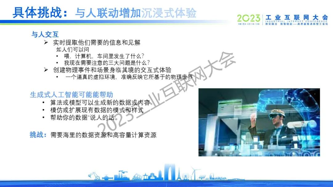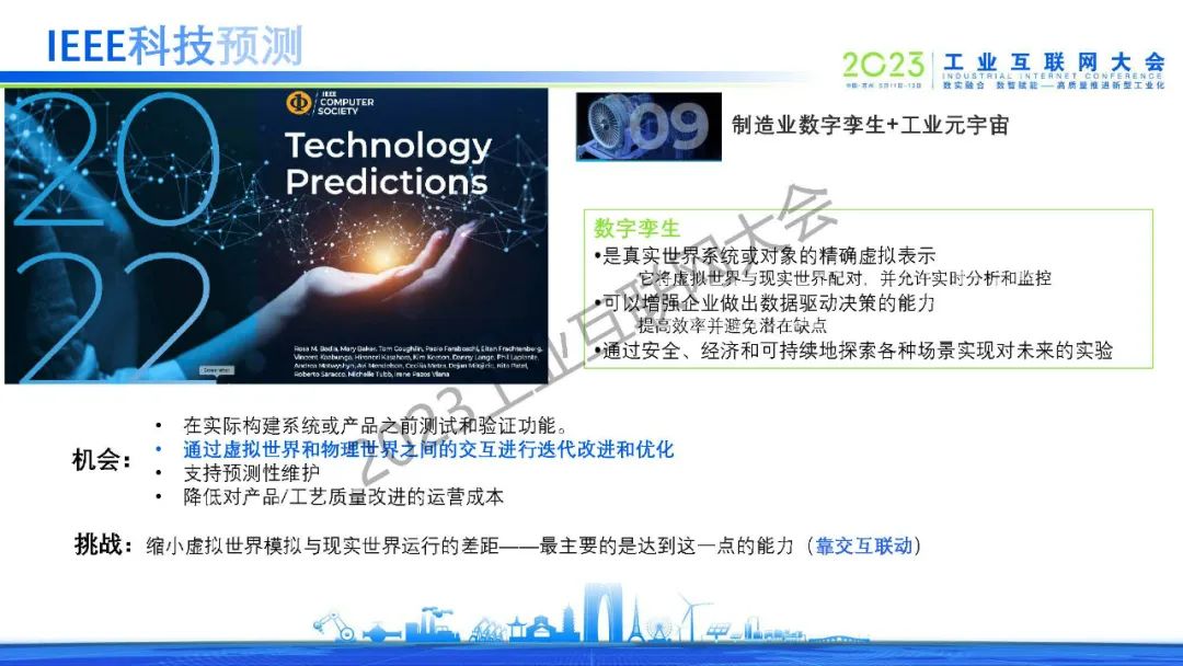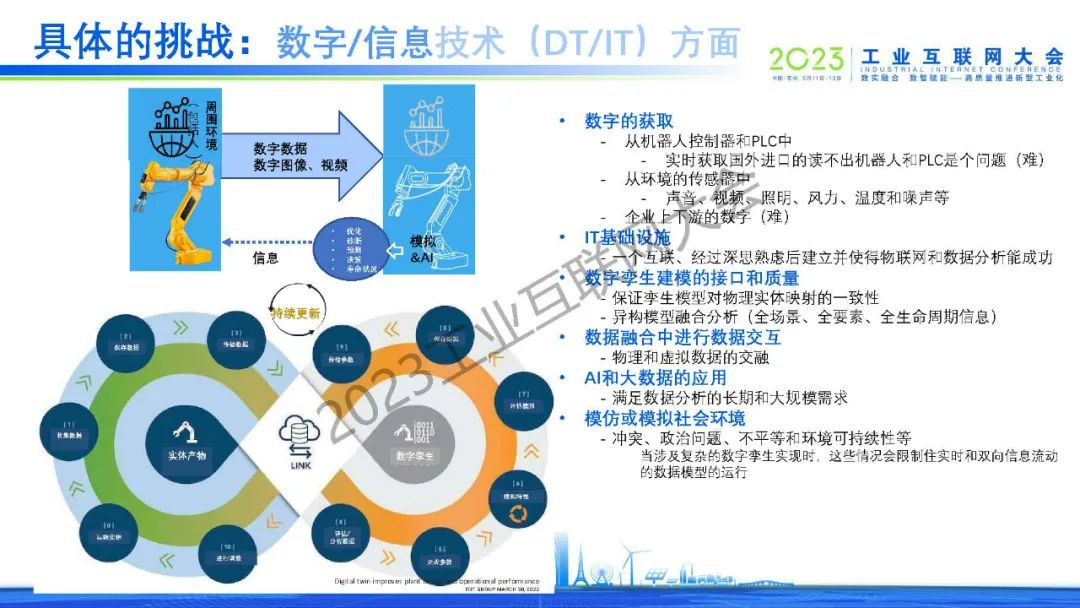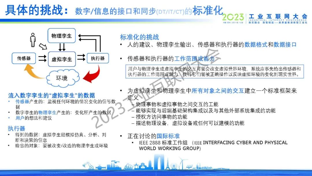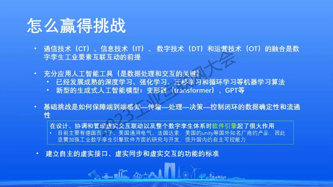 沈八中表示通信技術、信息技術、 數字技術(數據可視化技術)和運營技術的融合是數字孿生工業要素互聯互動的前提。人工智能工具是數字孿生中數據處理和交互的關鍵。當今人工智能除了已經發展成熟的深度學習、強化學習、遷移學習和循環學習等機器學習算法外,新型的以全概率和大型模型為基礎的生成式人工智能將起到決定性的作用。為讓全國乃至全球數字孿生技術的共同發展,我們應考慮建立自主的虛實接口、虛實同步和虛實交互的功能的標準。