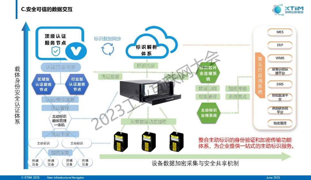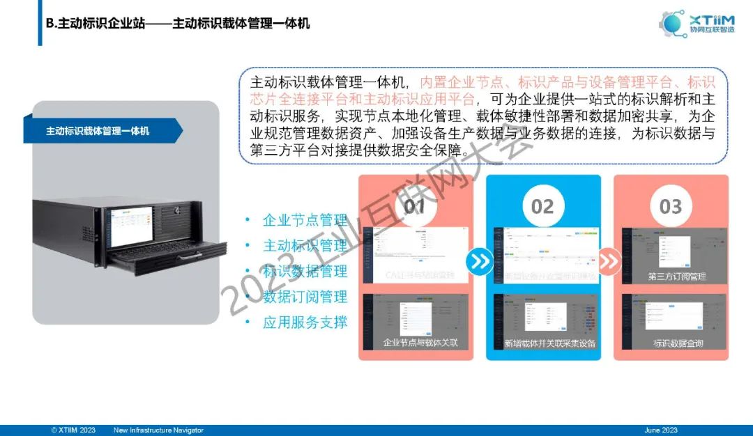 “主動標識載體管理一體機,內置企業(yè)節(jié)點、標識產品與設備管理平臺、標識芯片全連接平臺和主動標識應用平臺,可為企業(yè)提供一站式的標識解析和主動標識服務,實現節(jié)點本地化管理、載體敏捷性部署和數據加密共享,為企業(yè)規(guī)范管理數據資產、加強設備生產數據與業(yè)務數據的連接,為標識數據與第三方平臺對接提供數據安全保障。”
