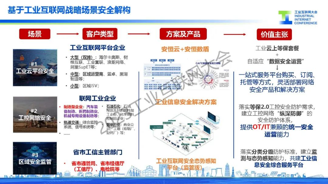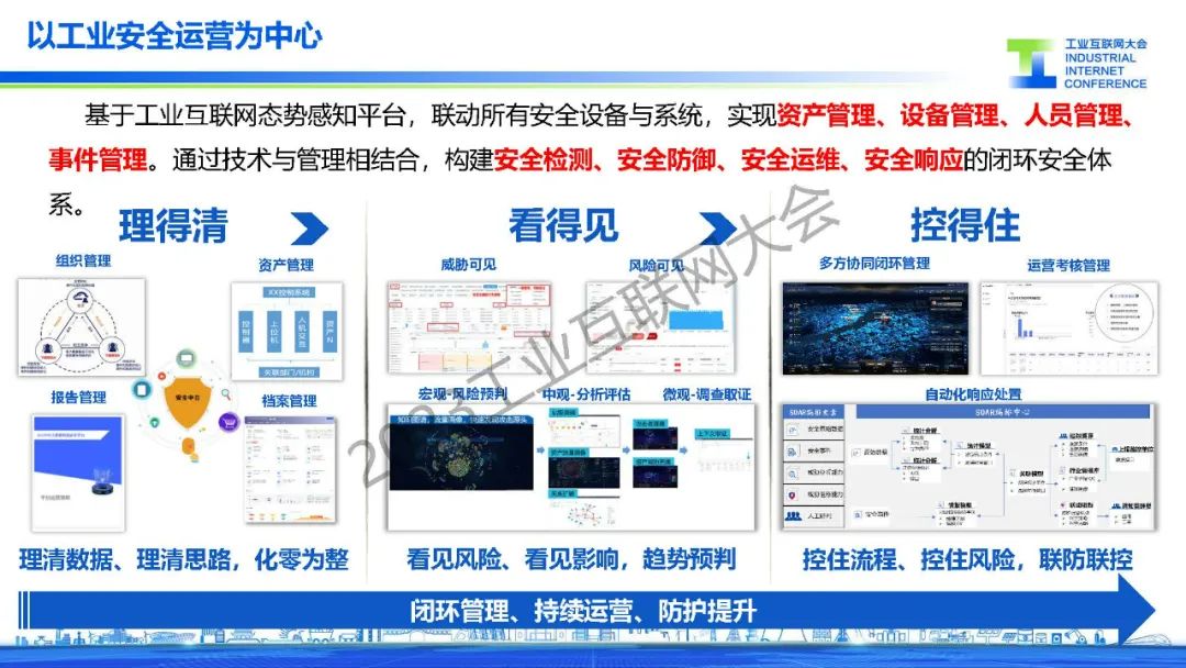 “基于工業(yè)互聯(lián)網(wǎng)態(tài)勢感知平臺,聯(lián)動所有安全設備與系統(tǒng),實現(xiàn)資產(chǎn)管理、設備管理、人員管理、事件管理。通過技術與管理相結合,構建安全檢測、安全防御、安全運維、安全響應的閉環(huán)安全體系。”