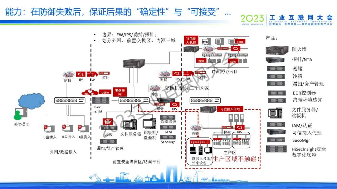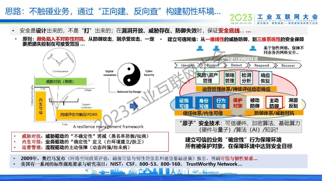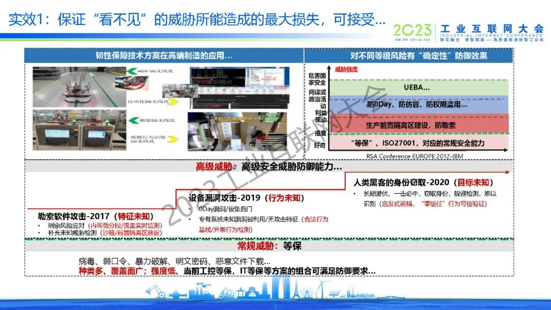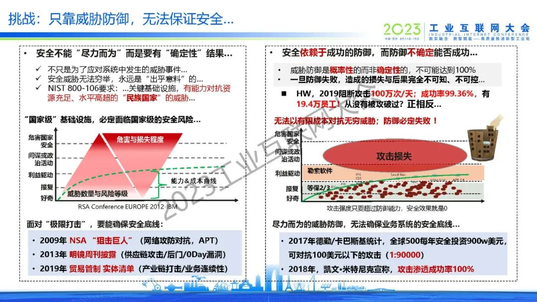 王雨晨指出,安全是產業數字化轉型中的“馬六甲海峽”,越有價值的系統,面臨的安全風險越大。對抗策略也需要超越線性對抗,從盡力對抗風險,到確保能承受風險。建立可信網絡:從一維線性的威脅防御,到三維系統性的安全保障,前置隔離區爭取最好情況,內網微隔離確保最壞結果可接受,運營管理區實現動態安全。