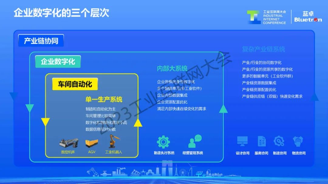 第一個(gè)層次是車(chē)間級(jí)的自動(dòng)化,是企業(yè)單一的生產(chǎn)系統(tǒng),主要解決工廠產(chǎn)線設(shè)備聯(lián)網(wǎng)以及自動(dòng)化制造的問(wèn)題。第二個(gè)層次是企業(yè)級(jí)的數(shù)字化,主要面向企業(yè)內(nèi)部綜合的資源調(diào)度,通過(guò)互通互聯(lián)工廠生產(chǎn)、銷(xiāo)售、倉(cāng)儲(chǔ)、物流等業(yè)務(wù)系統(tǒng),以實(shí)現(xiàn)企業(yè)資源的最優(yōu)配置。第三個(gè)層次涉及到產(chǎn)業(yè)鏈和供應(yīng)鏈的協(xié)同,需要從產(chǎn)業(yè)和行業(yè)的角度做協(xié)同和資源共享。幫助企業(yè)快速響應(yīng)上下游市場(chǎng)需求變化,以實(shí)現(xiàn)柔性制造。
