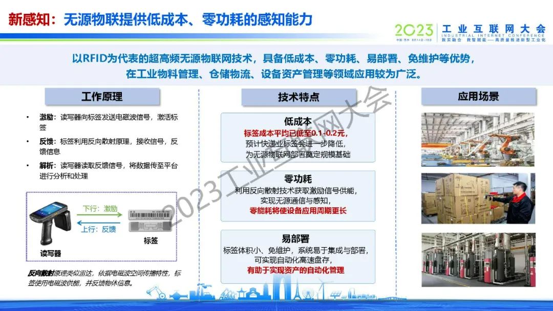 “無源物聯網將與蜂窩通信技術融合,架構向更廣覆蓋、更易組網演進,標簽的能量采集和感知能力不斷提升,將實現更遠的通信距離、更高的識別數量、更強的感知能力。“