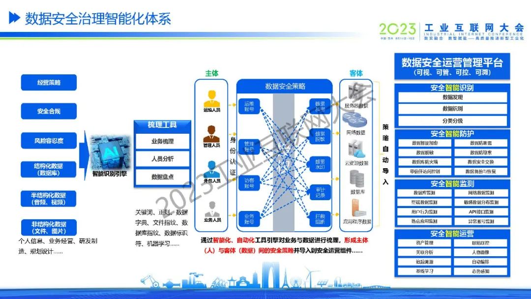“數(shù)據(jù)安全策略是通過智能化、自動化工具引擎對業(yè)務(wù)與數(shù)據(jù)進(jìn)行梳理,形成主體(人)與客體(數(shù)據(jù))間的安全策略并導(dǎo)入到安全運營組件。“