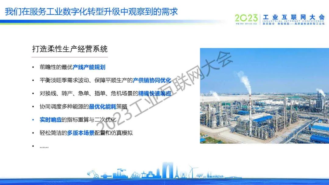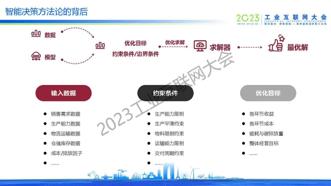 王曦分享了裝備、化工和耐用消費品的三個需求樣例,提出了在服務(wù)工業(yè)數(shù)字化轉(zhuǎn)型升級中觀察到的四大需求:數(shù)據(jù)驅(qū)動、決策導(dǎo)向、尋找最優(yōu)和快速前瞻。智能決策方法論是通過輸入數(shù)據(jù)和模型,在優(yōu)化目標和約束條件(邊界條件)下優(yōu)化求解出最優(yōu)解。