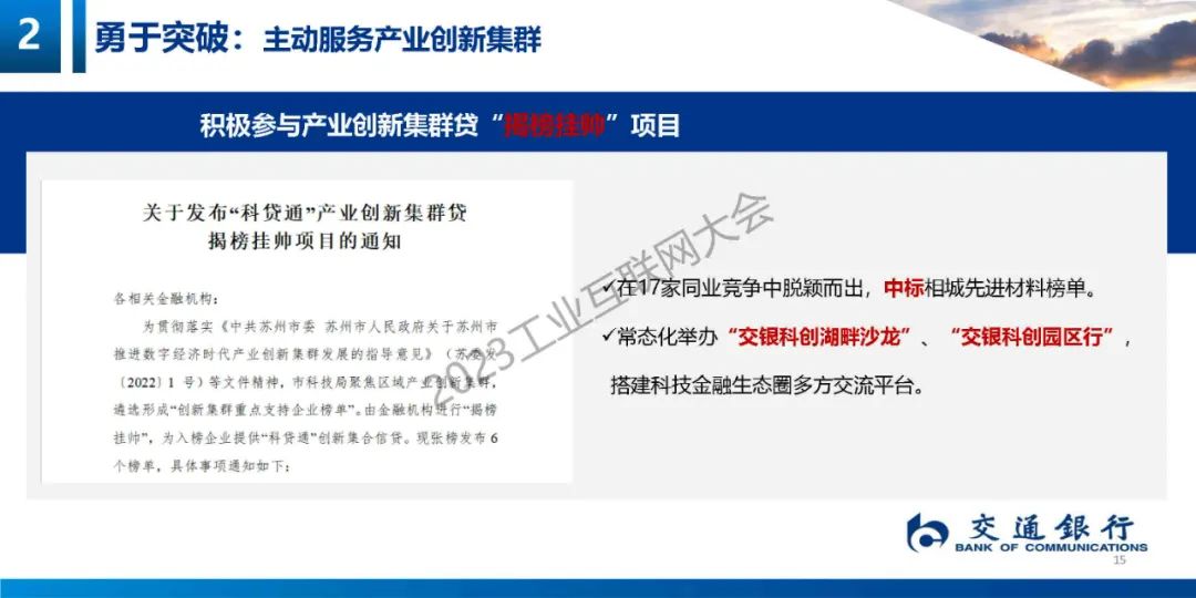 6月14日,在2023工業互聯網大會“工業互聯網產融推進論壇”上,交通銀行蘇州分行普惠金融事業部副總經理陳娟娟發表了《踐行“四敢精神”助力產業集群——“交銀科創 通達天下”科技金融產品路演》的主題演講。