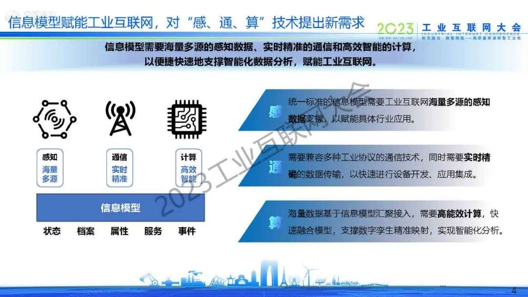 牛亞文指出,在數字經濟時代,數據和技術成為經濟發展核心要素。工業互聯網作為融合產業數據與信息技術的新興業態和應用模式,是數字經濟的重要推動力。工業互聯網數據互通困難,信息模型為工業互聯網提供統一描述規范,打通數據孤島,助力工業數字化升級。信息模型需要海量多源的感知數據、實時精準的通信和高效智能的計算,以便捷快速地支撐智能化數據分析,賦能工業互聯網。