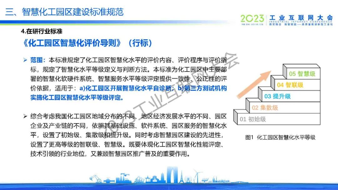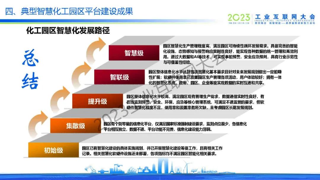 馬從越介紹,智慧化工園區是以信息與通信技術為支撐,圍繞安全生產、環境管理、應急管理、封閉化管理、運輸管理、能原管理、辦公管理、公共服務和保障體系等領域,通過數據整合與信息平臺建設實現智慧化管理與高效運行的化工園區?;@區智慧化發展路徑從初始級、集散級、提升級、智聯級到最后的智慧級。