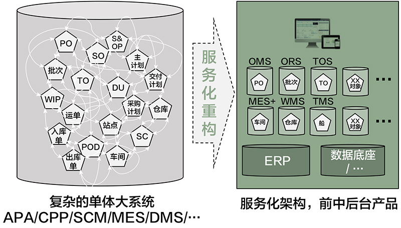 傳統的供應鏈IT系統是煙囪式的,隨著業務增長、需求變化加快,會出現用戶體驗差、重復建設、響應周期長等問題,不能適應業務發展的需要。通過對復雜的單體大系統進行服務化改造,讓服務化子系統融合業務要素、應用要素和數據要素,可以實現業務、數據與系統功能的銜接(如圖2)。