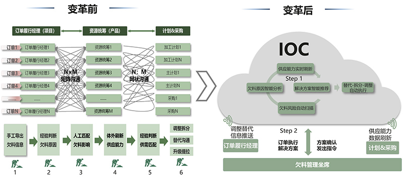 IOC打破了功能的“墻”和流程間的“堤”,實現關鍵業務場景下跨功能、跨流程和跨節點的合成運營,以及異常發現與問題解決之間的快速閉環。以華為深圳供應中心訂單履行異常管理為例(如圖4):在變革前,訂單履行異常管理是一項高能耗業務,需要100多名訂單履行經理分別與統籌、計劃、采購等角色溝通,再進行分析和處理;構建IOC后,系統可以自動發現異常、定位、分析原因并提供方案建議,從之前的人工操作變成了系統自動處理加人工輔助確認,作業效率提升了31%。