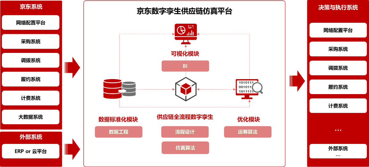 京東數字孿生供應鏈仿真平臺允許業務對現狀的生產系統及業務流程進行數字建模,同時也支持業務對未來可能的供應鏈模式進行流程設計,評估新流程的可行性及優化結果?;趯Σ煌呗苑抡娼Y果的分析,最終將優化后的策略落實到執行系統進行實施。京東供應鏈仿真平臺搭建了一套標準化的供應鏈框架,為了能夠靈活適配零售不同業務模式及不同行業特性,以模塊化的形式進行了產品架構設計,各模塊彼此解耦,獨立迭代,可以支持豐富的應用場景。