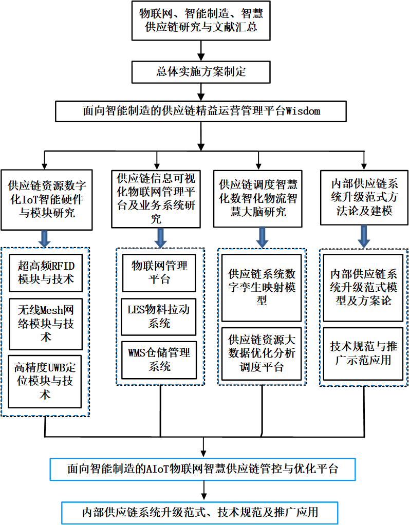 TBL華清科盛搜集物聯網、智能制造、智慧供應鏈的研究文獻與資料,針對制約企業智能制造轉型的內部供應鏈系統數智化程度低、管理手段落后、供應鏈運營數據采集與利用有效性低、供應鏈供給保障缺乏前瞻性預測等技術難題進行重點研究,通過對IoT智能硬件與裝備、物聯網管理平臺與業務系統、供應鏈資源大數據優化分析平臺等研究與集成創新,為內部供應鏈系統數智化升級提供關鍵技術、IoT硬件模塊及系統解決方案,建設面向智能制造的供應鏈精益運營管理平臺Wisdom?進行示范驗證;同時,提出并制定內部供應鏈系統數智化升級范式方法論及相關技術規范,在行業內進行推廣應用。本項目的實施技術路線如下圖所示。