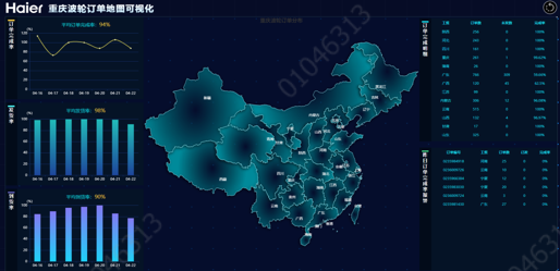 衣聯(lián)網(wǎng)重慶研究院整合各方資源,對(duì)重慶波輪工廠的原材料入廠,前工序生產(chǎn),總裝生產(chǎn)及檢驗(yàn),成品下線入庫及發(fā)運(yùn)引入中控室大數(shù)據(jù)中心進(jìn)行全流程的數(shù)據(jù)整合,實(shí)現(xiàn)對(duì)工廠數(shù)據(jù)進(jìn)行預(yù)防性分析。大數(shù)據(jù)中央控制室分為十個(gè)部分:訂單地圖可視、物流3D模擬、中央控制室、前工序總控、總裝經(jīng)營體總控、總裝1線總控、總裝2線總控、總裝3線總控、總裝5線總控、產(chǎn)品工藝操作介紹。