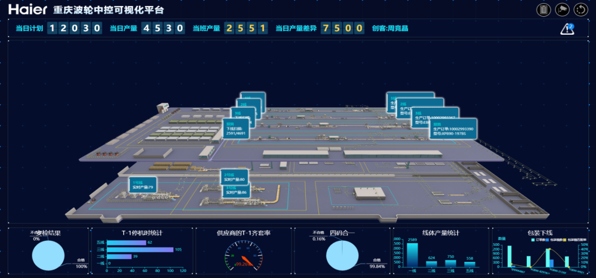 中央控制室四條總裝線的當(dāng)日計(jì)劃產(chǎn)量、當(dāng)時(shí)實(shí)際產(chǎn)量、當(dāng)班產(chǎn)量,展示最新的當(dāng)量不良率。工程不良餅狀圖。展示當(dāng)天四條總裝線的不良現(xiàn)象占比。展示目標(biāo)合格率和和實(shí)際合格率。訂單執(zhí)行展示展示當(dāng)天四條總裝線的當(dāng)天訂單數(shù)量和執(zhí)行數(shù)量。時(shí)序生產(chǎn)展示的是總裝四條線的單小時(shí)產(chǎn)量柱形圖,各線體安檢儀結(jié)果展示。T-1停機(jī)時(shí)統(tǒng)計(jì)展示展示的是昨日總裝四條線(一、二、三、五線)分別的停機(jī)時(shí)間統(tǒng)計(jì)柱形圖,昨日物料齊套率展示。每天四碼合一合格率展示。