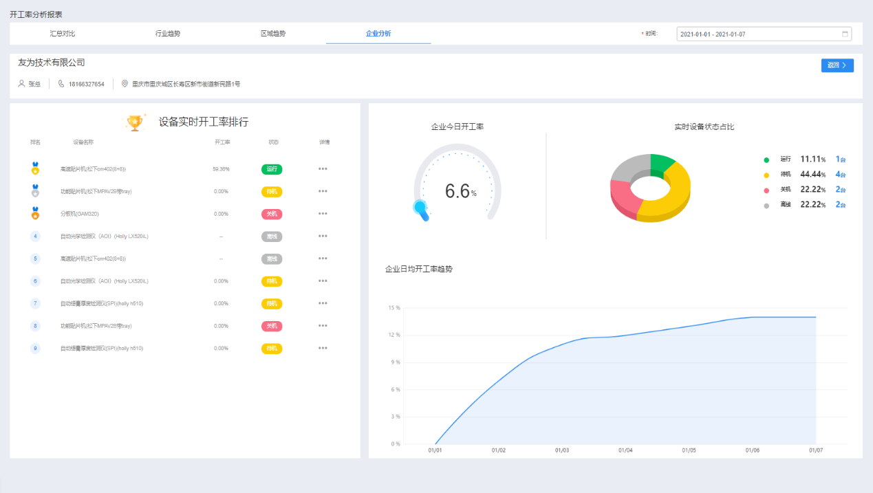 工廠整體設備開工率看板可主動推送當前設備的開工率及健康狀況,以紅亮箱包公司管理者為代表的中小微制造業企業主,可及時遠程了解工廠實際開工表現,從而可以更有目標性地進行產能優化,提高設備整體利用率。