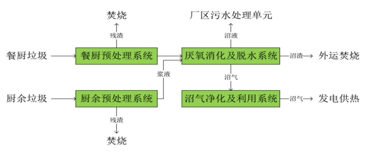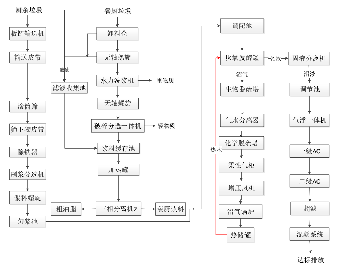 餐廚廢棄物和廚余廢棄物進場地磅稱重后卸至接投料倉,進入不同的預處理生產線。餐廚垃圾通過無軸螺旋輸送進入水力洗漿機、破碎分選一體機分別去除重物質和塑料輕物質,制漿后與廢棄油脂混合,經過加熱后進入三相分離機,進行全物料提油,三相分離之后的漿料與分選破碎制漿的廚余垃圾漿料混合泵入CSTR厭氧單元進行厭氧消化,產生的沼氣經生物脫硫系統凈化后進入氣柜暫存,經凈化增壓后發電和供鍋爐燃燒。產生的沼渣沼液進入固液分離系統實現固液分離,分離出的沼渣送入焚燒廠,沼液進入污水處理單元處理,處理達標后進入城鎮排水管網排放。