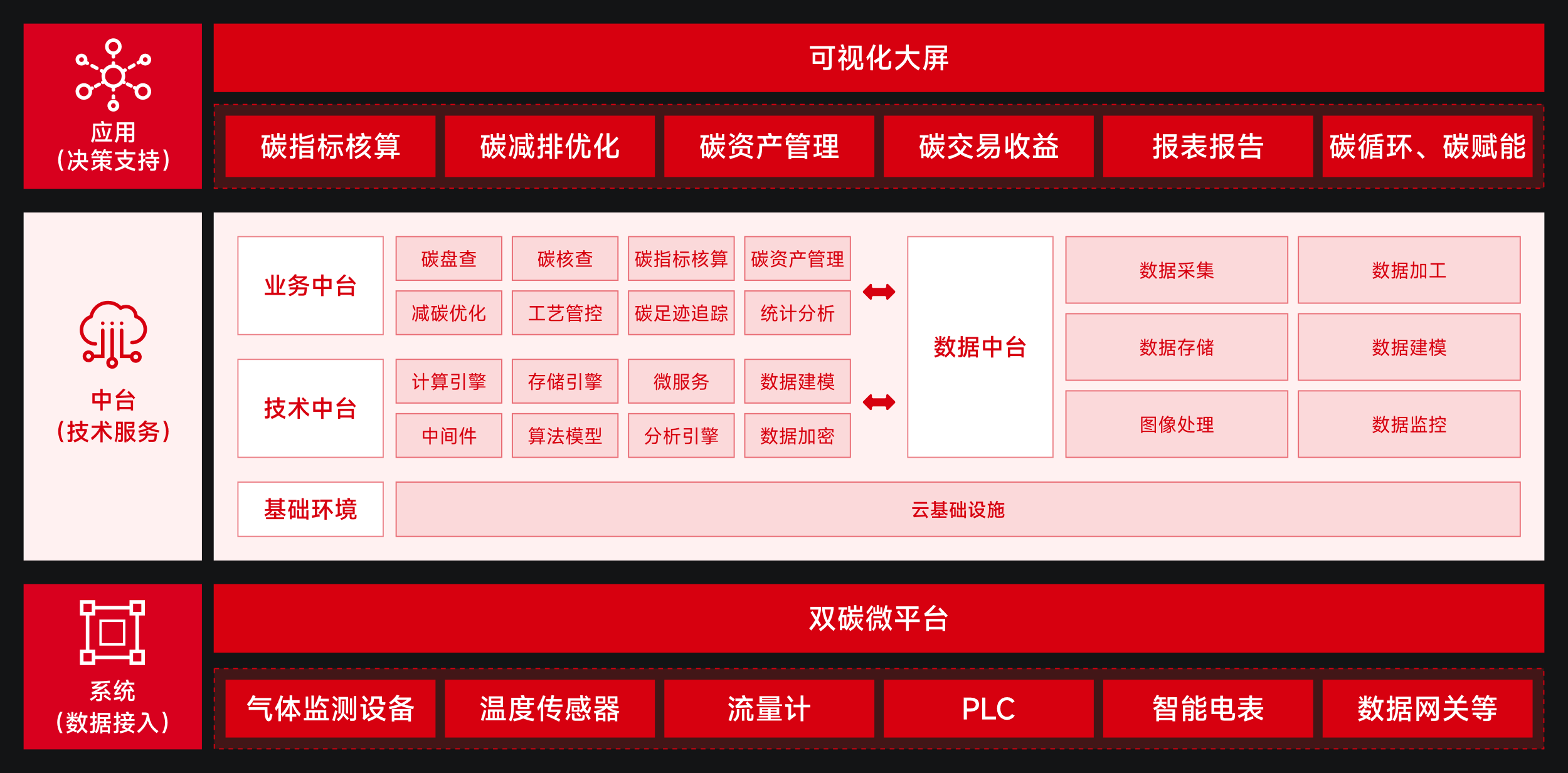 富陽區循環經濟產業園餐廚垃圾處置項目實施的雙碳數據中心能夠有效地解決以上問題,并具備良好的實施成效。雙碳數據中心是基于E平臺(Eiiplat環境產業互聯網平臺)和微平臺,利用國家備案方法學打造,并通過雙碳微平臺落地應用的軟硬件配套的智慧化系統。通過雙碳微平臺及相關傳感設備進行數據采集,在中臺進行數據傳輸、存儲與優化,支撐上層功能實現,為不同用戶提供服務。