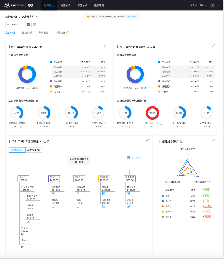 能源分析:能源分析是在企業明確能源系統結構,并且接入大量儀表傳感器數據的基礎上,對企業能源系統、能源消耗進行深入的監視分析,分析的維度包括平衡維度、質量維度、安全維度、用能成本維度等。