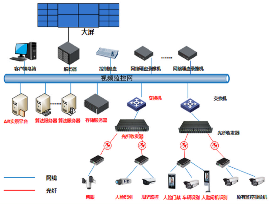 感知層:系統(tǒng)前端感知設(shè)備包含AR攝像頭、普通監(jiān)控?cái)z像頭,人臉識(shí)別攝像機(jī)、車牌攝像機(jī)、周界防范攝像機(jī)、明火檢測(cè)攝像機(jī)等告警終端/系統(tǒng)。
