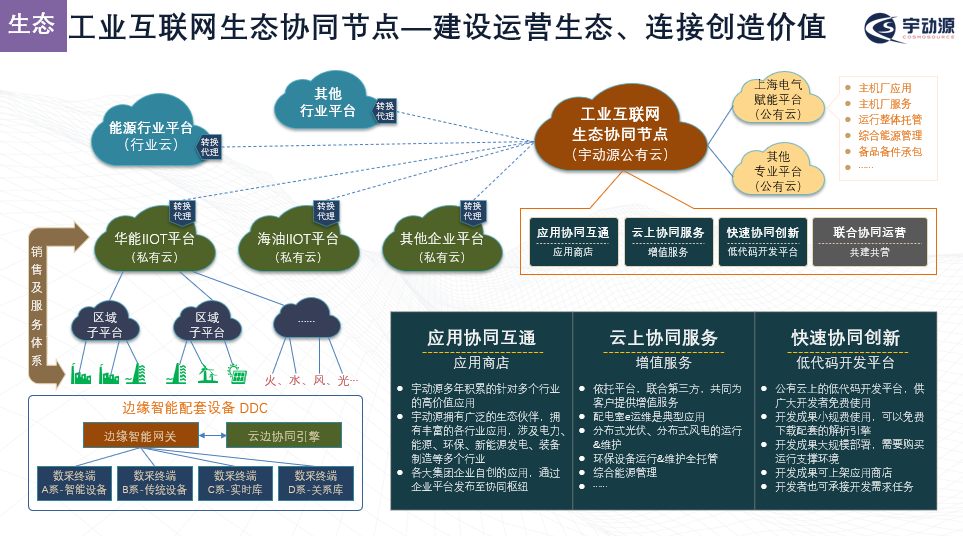 在協(xié)同共享方面,宇動源通過公有云建設工業(yè)互聯(lián)網(wǎng)的生態(tài)協(xié)同節(jié)點,將行業(yè)應用轉(zhuǎn)換代理鏈接到行業(yè)已有平臺的私有云內(nèi),供區(qū)域的子平臺使用;以平臺鏈接為基礎,實現(xiàn)產(chǎn)業(yè)上下游融合、服務商新模式探索以及產(chǎn)學研流程化的改造,真正實現(xiàn)能源行業(yè)生態(tài)良性發(fā)展和企業(yè)平臺的價值釋放。