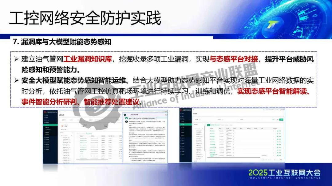 賈立東介紹,目前,國家管網所轄油氣管道近11萬公里,已形成“三縱四橫、連通海外、覆蓋全國”的大型“廣域分布”油氣輸送網絡,管道輸送的成品油、原油、天然氣在全國年消費量占比達到 28%、35%和 60%,成為國民經濟的“能源生命線”。工控網絡安全防護結合大模型助力態勢感知平臺實現對海量工業網絡數據的實時分析,依托油氣管網工控仿真靶場環境進行持續學習、訓練和調優,實現態感平臺智能解讀、事件智能分析研判、智能推薦處置建議。