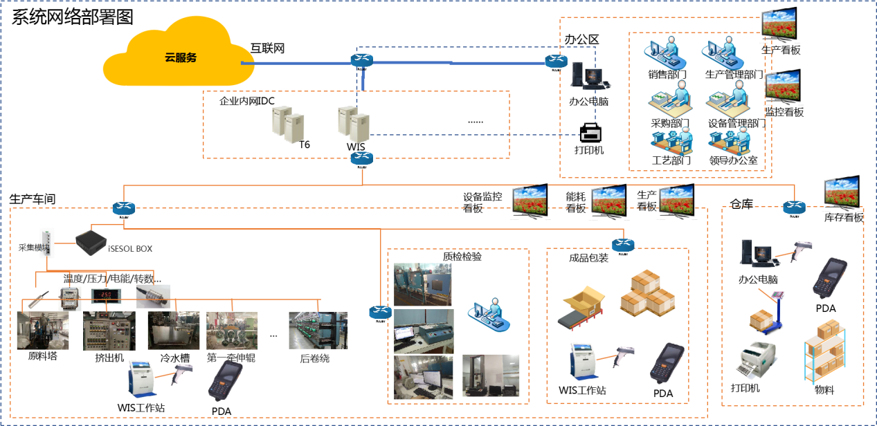 (2)將生產設備聯網,設備運行數據采集及相關工段設備的能耗數據采集,解決設備運行數據孤島問題,實時掌握設備運行工藝參數、對工藝參數進行監控預警,保證產品生產質量,實時掌握設備能耗情況及全廠各部門的能耗情況、對全廠各部門能耗進行監控管理及統計分析。