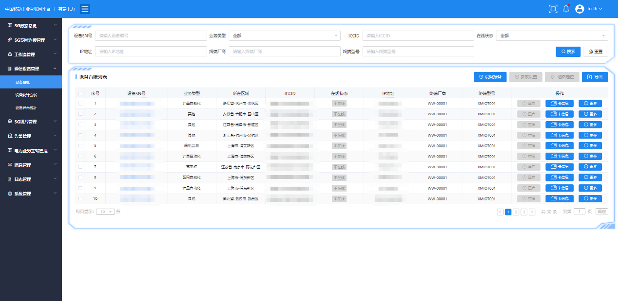 5G電力專網連接管理,可實現對于電力業務中使用的無線通信卡資源的管理,對其進行記錄和統計分析。無線通信卡數據包括IP地址管理、域名管理、卡資費情況、流量使用情況等。目前平臺已接入1萬多張物聯卡,建立卡臺賬、資費等信息,實現物聯網卡的精細化管理。