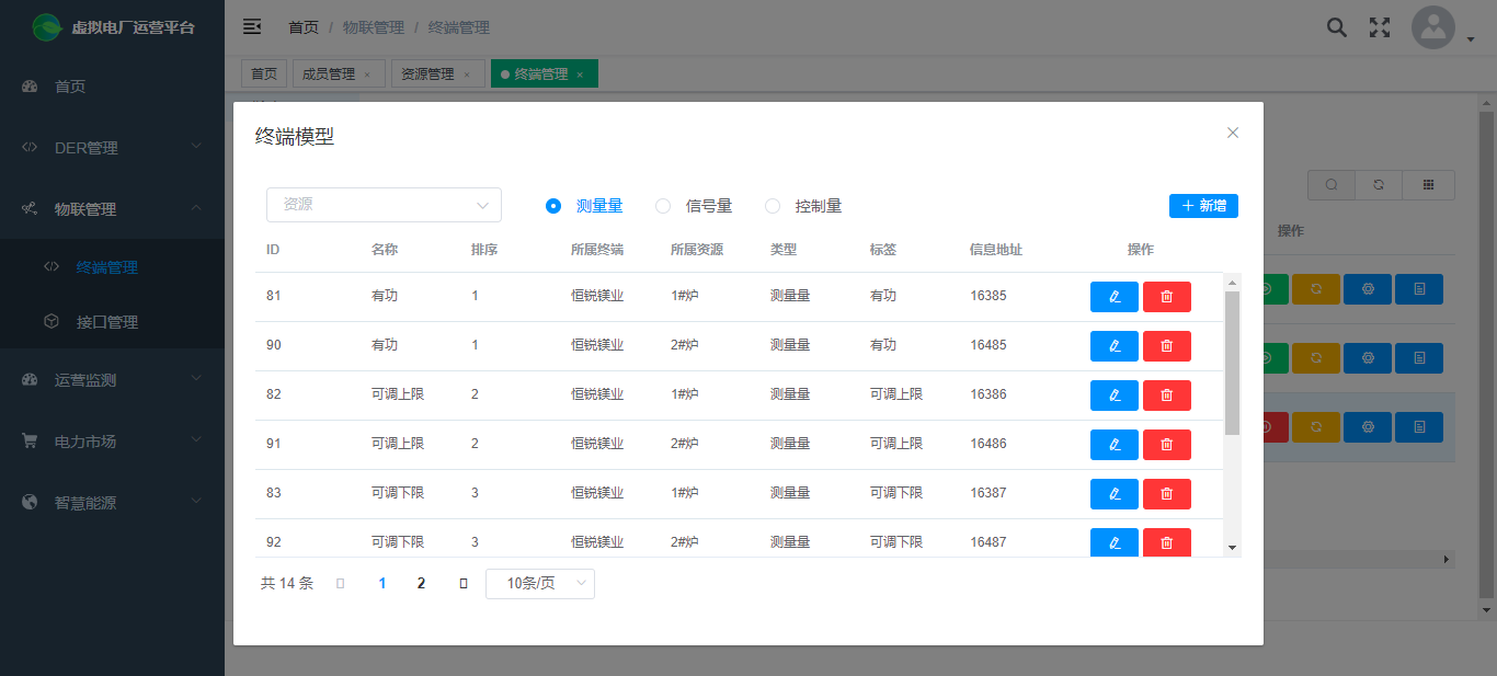 物聯管理用于維護虛擬電廠對外通信相關的參數信息與模型配置。