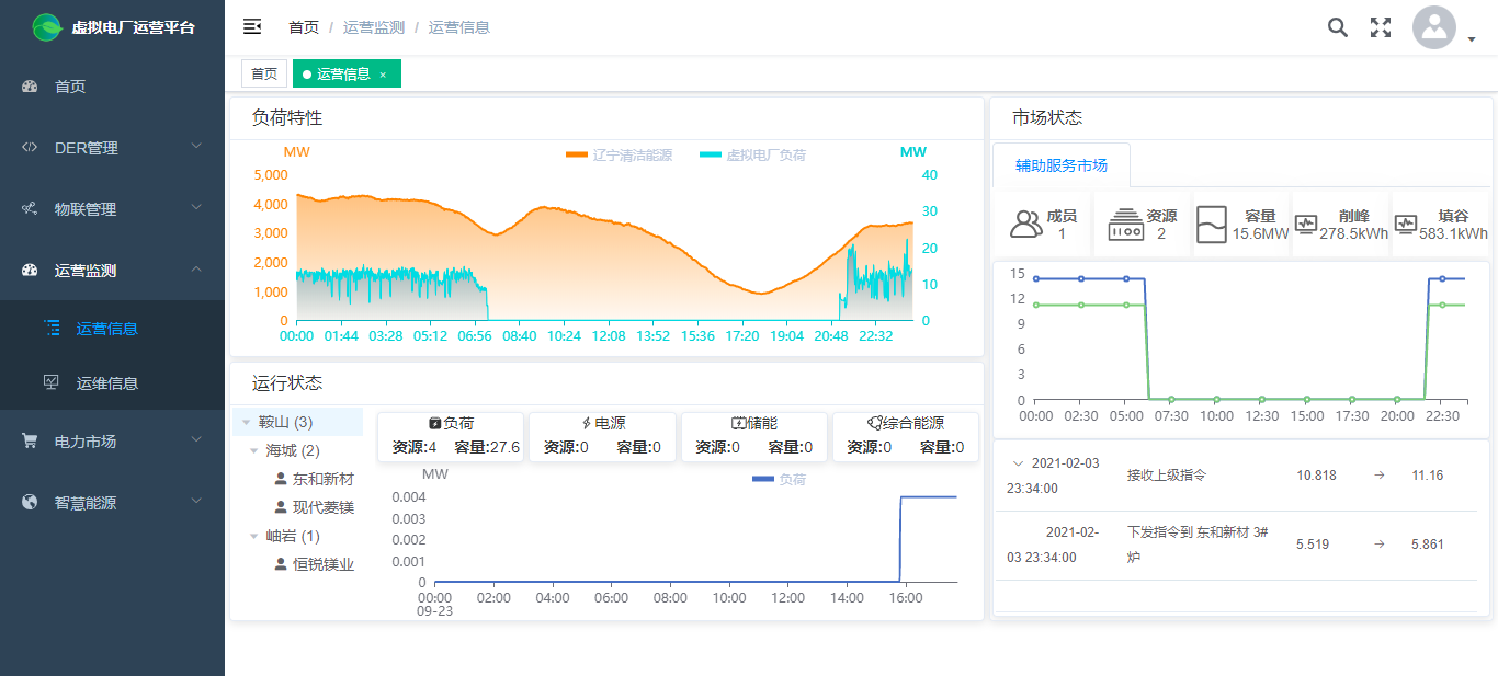 運營信息:展示虛擬電廠參與電網的特性信息,包含清潔能源日曲線、負荷日曲線;展示虛擬電廠資源接入情況與區域運行曲線;展示虛擬電廠參與輔助服務市場的運營信息,包含資源統計、可調范圍、調峰事件。