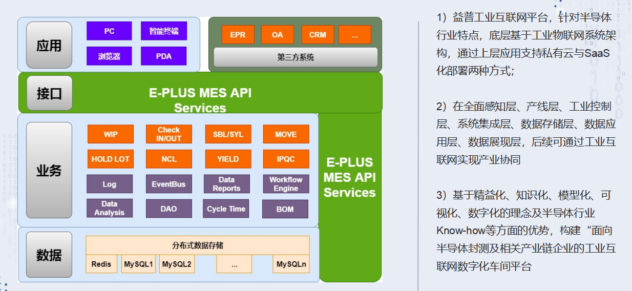 半導(dǎo)體制造工業(yè)軟件一直由國外公司及臺(tái)灣公司提供,國內(nèi)懂行業(yè)know-how又能結(jié)合新一代信息技術(shù)實(shí)現(xiàn)商用產(chǎn)品的公司屈指可數(shù),益普屬于最早一批在行業(yè)探索的公司。益普成立時(shí),用基于互聯(lián)網(wǎng)技術(shù)實(shí)現(xiàn)工業(yè)軟件的思路,屢次遭到同行的嘲笑和不解,但是還沒有MES的概念,益普艱難探索,在工業(yè)軟件的道路上,一直堅(jiān)持新一代信息技術(shù),堅(jiān)持工業(yè)互聯(lián)網(wǎng)的技術(shù)路徑迭代產(chǎn)品,堅(jiān)持采用時(shí)序數(shù)據(jù)庫、微服務(wù)架構(gòu)、數(shù)據(jù)機(jī)器人等產(chǎn)品方向,最終在客戶占有率上戰(zhàn)勝了國外及臺(tái)灣的軟件提供商。為國內(nèi)半導(dǎo)體封裝測試行業(yè)提供了高性價(jià)比的數(shù)字轉(zhuǎn)型服務(wù),得到了很多客戶的認(rèn)可,為國內(nèi)半導(dǎo)體封測行業(yè)的數(shù)字化轉(zhuǎn)型做出了自己的貢獻(xiàn)。