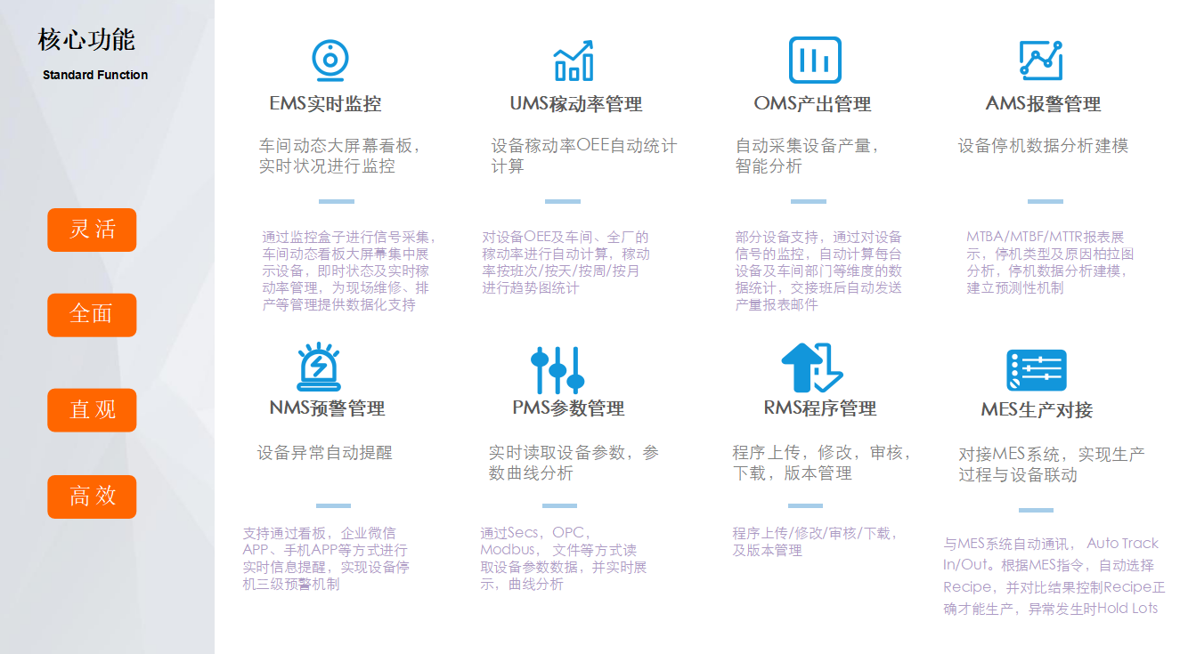 效率:設(shè)備無實(shí)時(shí)狀態(tài)監(jiān)測,稼動(dòng)率OEE低;