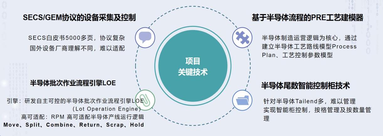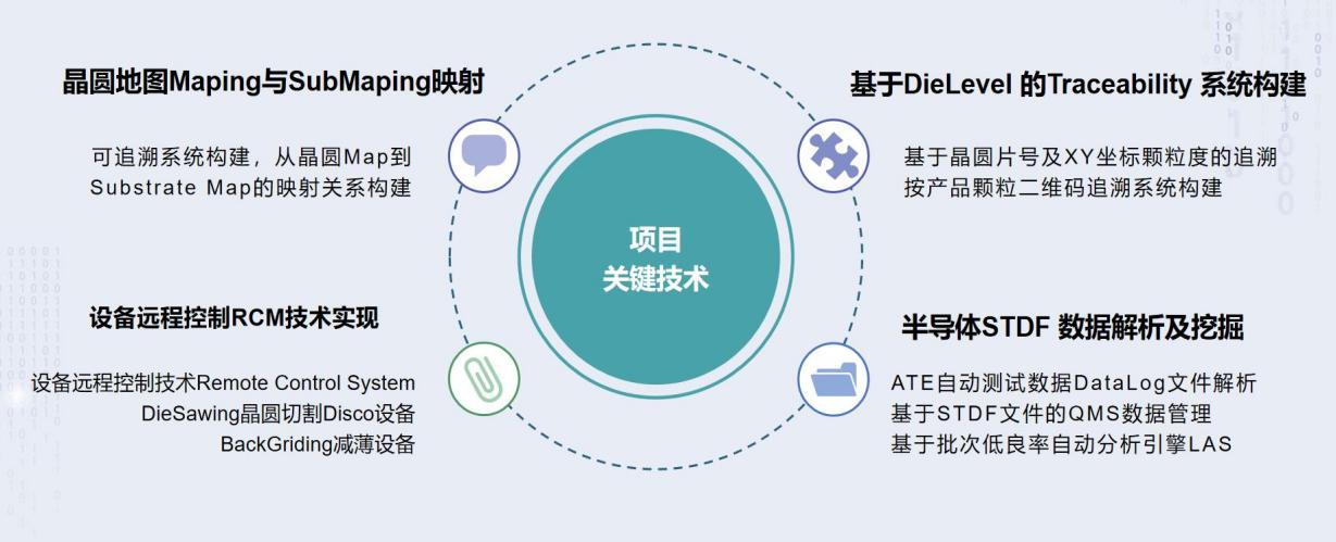 團(tuán)隊(duì)立足自主研發(fā),挑戰(zhàn)行業(yè)空白,開發(fā)針對于半導(dǎo)體封裝測試行業(yè)的“硅芯似箭”SiFactory半導(dǎo)體數(shù)字化工廠解決方案。技術(shù)創(chuàng)新包括半導(dǎo)體SECS/GEM協(xié)議解析,半導(dǎo)體工藝流程PRE建模器,晶圓地圖Maping與SubMaping映射,半導(dǎo)體STDF 數(shù)據(jù)解析及挖掘以及DieLevel 的Traceability 系統(tǒng)構(gòu)建等。