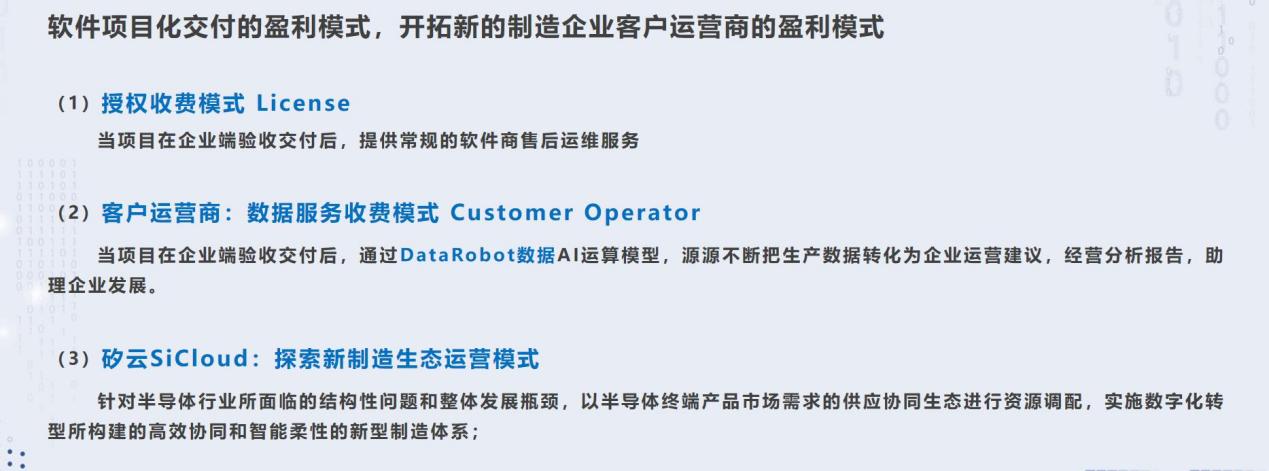基于半導(dǎo)體封測行業(yè)服務(wù)的特點(diǎn),根據(jù)我們現(xiàn)有的客戶群體及技術(shù)能力,益普提出“數(shù)據(jù)驅(qū)動(dòng)決策Data Driving Decision”的口號(hào),從軟件廠商到數(shù)字化廠商,除了軟件授權(quán)的收費(fèi)方式外,真正挖掘軟件產(chǎn)生的數(shù)據(jù)價(jià)值,切實(shí)為企業(yè)降本增效,通過提供數(shù)據(jù)服務(wù)數(shù)據(jù)機(jī)器人DataRobot的方式,源源不斷給企業(yè)提供運(yùn)營建議及經(jīng)營分析報(bào)告,助力企業(yè)持續(xù)發(fā)展。通過數(shù)據(jù)服務(wù)的收費(fèi)模式,產(chǎn)生持續(xù)的收入來源。做客戶運(yùn)營商Customer Operator。