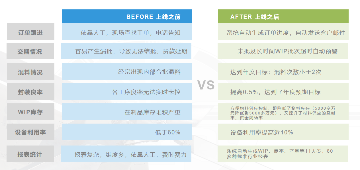 典型案例深圳盛元半導(dǎo)體,與益普建立合作關(guān)系后,全面開展半導(dǎo)體封測車間的數(shù)字化轉(zhuǎn)型工作,項(xiàng)目實(shí)施后,根據(jù)客戶反饋經(jīng)濟(jì)收益如下: