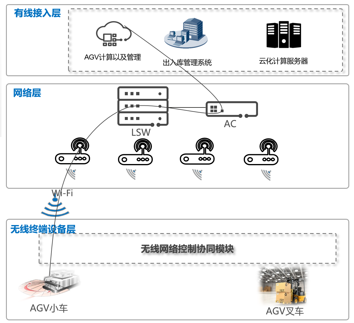 對于以上提到的揀選、分揀場景,都需要通過WLAN網(wǎng)絡實現(xiàn)AGV小車位置、狀態(tài)信息上報,和任務、運行控制指令的下發(fā)。WLAN網(wǎng)絡需要保障運行控制信息實時、可靠、正確傳遞給目標設備。