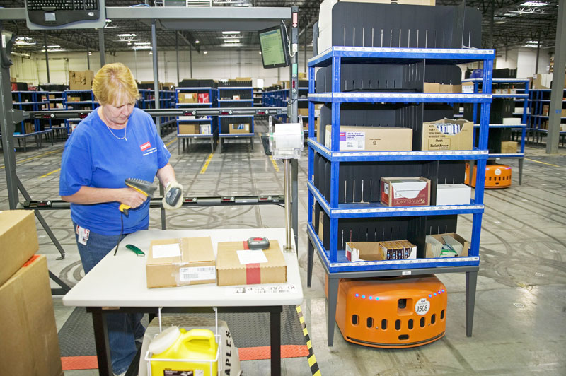 傳統(tǒng)有人倉庫,貨物采用人工揀選方式。即人員根據(jù)訂單信息,在貨架區(qū)域中尋找貨物。然后將找到所有貨物掃碼、裝框后交給打包環(huán)節(jié)。需要人力投入大、勞動強度較高、揀選效率難以滿足忙時要求。